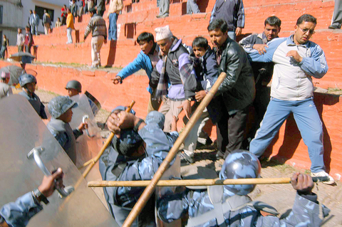On Saturday police arrested more than 230 people after anti-royal demonstrators in Kathmandu clashed with officers who used tear gas and carried firearms in place of their usual bamboo batons.