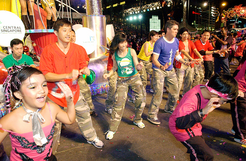 Clad in military-style pants, bright T-shirts and dangling chains, 12 Singaporean lawmakers grooved to hip-hop music at the city-state's largest annual street parade.
