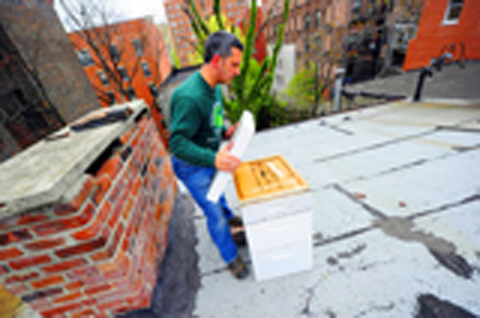 Andrew Cote uses the emergency fire ladder to climb up to the roof of his East Village building, where he tends to 250 bee hives.