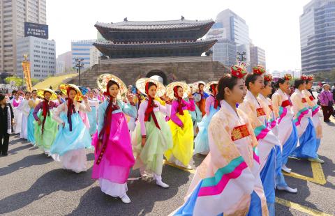 South Korean women in traditional clothes march in front of the historic Namdaemun (South Gate) in central Seoul during its reopening ceremony yesterday. The ancient gate was reopened to the public five years after the landmark was destroyed in an arson attack.May 05, 2013