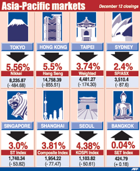 The MSCI Asia Pacific Index lost 3.5 percent to 84.97 as of 4:20pm in Tokyo after senators voted down a bill to provide US$14 billion in emergency funds for General Motors Corp and Chrysler LLC. Honda Motor Co and Nissan Motor Co plunged more than 11 percent. The US dollar fell to a 13-year low against the yen, while the cost of protecting Asian bonds against default advanced. Metals and crude oil prices slumped.