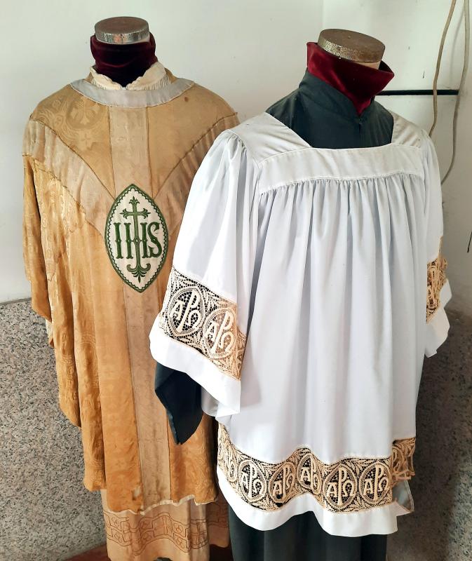 In addition to priests’ vestments, there is a chalice, a thurible (a small censer suspended by chains), an oil stock (a vessel for holy anointing oil) and a charcoal rubbing of the 1874 edict.