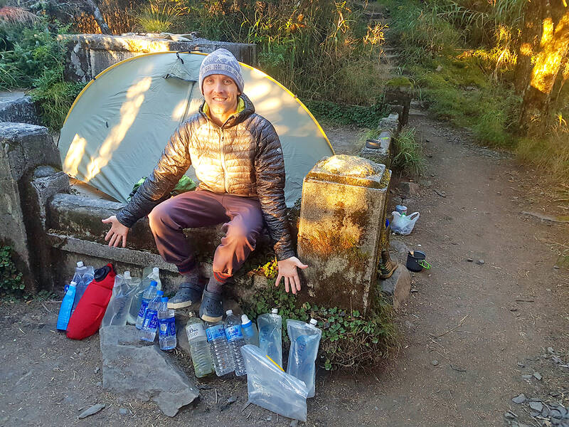 On New Year’s Day, 2021, I set out with two friends, Jeffrey and Wei-chun, on the Beidawu Mountain Trail. The first day was relatively straightforward, as we made our way up the well-maintained trail alongside a crowd of other hikers. Even on this day, however, our task was harder than theirs. As the Wandao Traverse (彎刀縱走) is a dry trail, we had to carry an extra three days’ worth of water on our backs.