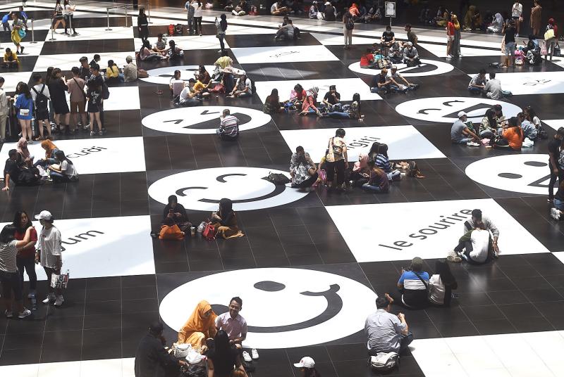 The word “smile” was translated into 10 languages — Mandarin, English, Japanese, Korean, French, Vietnamese, Indonesian, Filipino, Thai and Malaysian — with the decals placed in squares next to the smiley faces to highlight the floor’s checkerboard pattern.