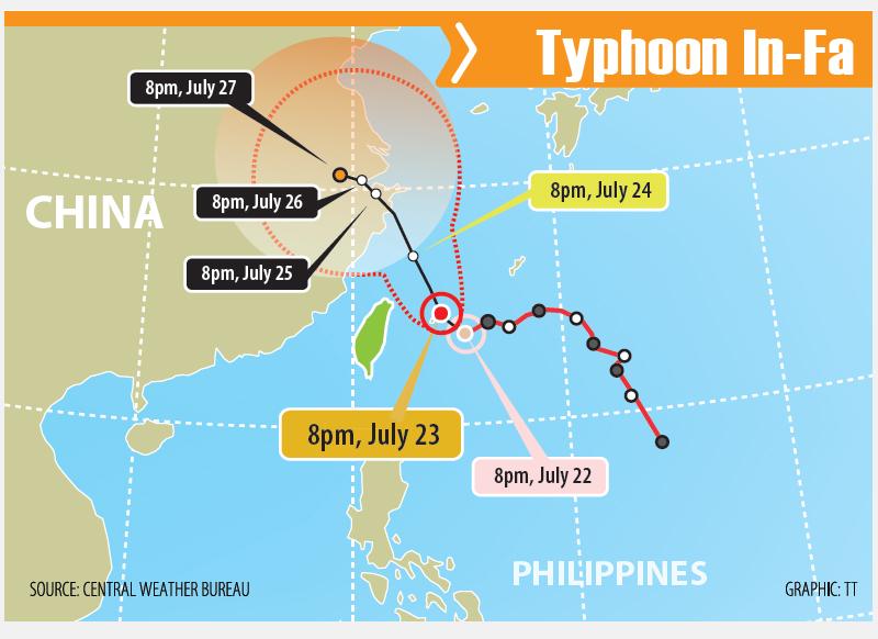 As of 8:30pm yesterday, In-Fa’s center was 470km southeast of Taipei, moving northwest at 6kph. It was carrying maximum sustained winds of 180kph, and had a radius of 200km.
