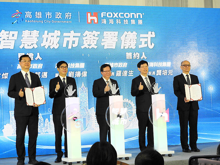 The two sides signed a letter of intent at a ceremony at the Kaohsiung Software Park, attended by Vice Premier Cheng Wen-tsan (鄭文燦), Kaohsiung Mayor Chen Chi-mai (陳其邁) and Hon Hai chairman Young Liu (劉揚偉), the city said in a statement.