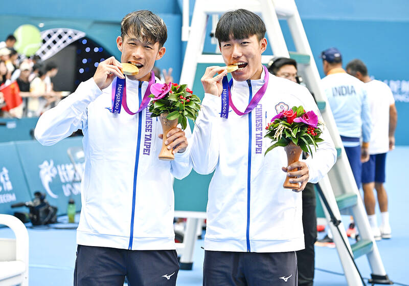 Taiwanese tennis players Hsu Yu-hsiou (許育修) and Jason Jung (莊吉生) yesterday dispatched an Indian duo in straight sets in the men’s doubles final to notch Taiwan’s fifth gold medal at the Asian Games in Hangzhou, China.