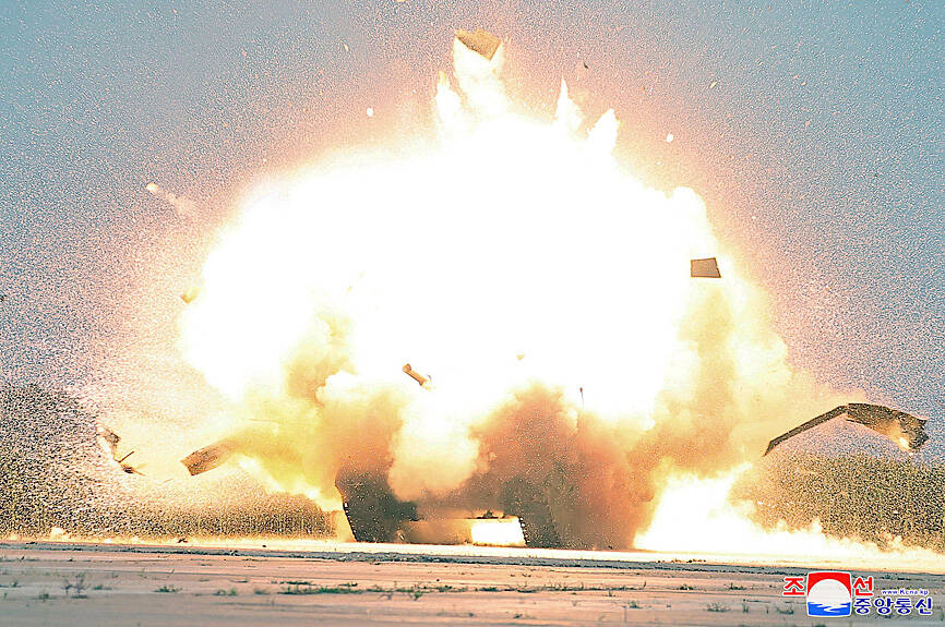 North Korean test photographs showed a white drone with X-shaped tails and wings supposedly crashing into and destroying a target resembling South Korea’s main K-2 battle tank. Most combat drones stand off from targets and fire missiles.