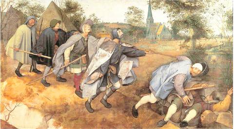 This phrase was later included in the collection of Greek and Latin proverbs Collectanea Adagiorum, published in 1500 by Dutch humanist Desiderius Erasmus Roterodamus, seven decades before Pieter Bruegel the Elder (c. 1525-1569) painted The Blind Leading the Blind, this being the idiom now used to refer sardonically to the foolishness of people following those who have no idea what they are doing.