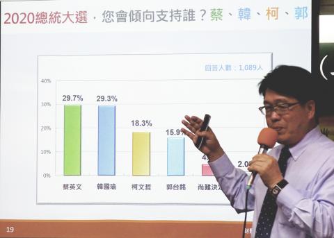Tsai’s lead over Han in a two-way race is a not strong, foundation chairman Michael You (游盈隆) said, adding that if Ko joins the election, the margin between them makes it unclear who would win.