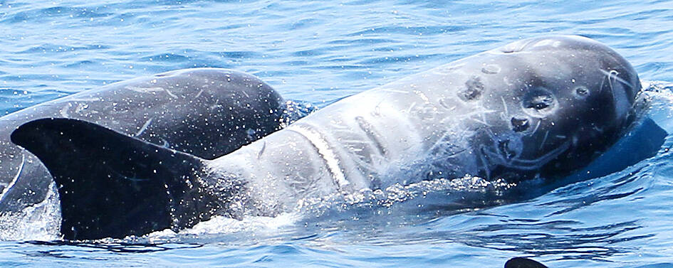 Foundation researcher Hu Chieh-hsi (胡潔曦) said that they have tracked 50 Risso’s dolphins and found that 19 of them had sustained scars that were suspected to be caused by human activities, likely by the fishing and shipping industries.