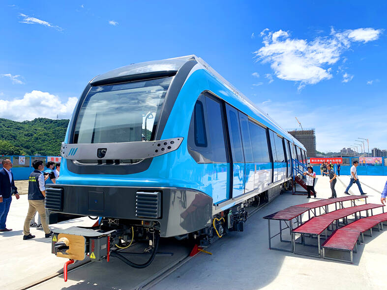 Trains for the Sanying light-rail being built in New Taipei City were presented to the media yesterday, which have safety features that were added following a fatal accident on the Taichung MRT in May.