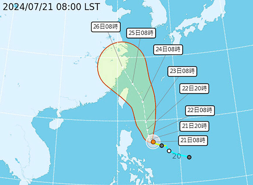 Former Weather Forecast Center director Daniel Wu (吳德榮), who is now an adjunct associate professor of atmospheric sciences at National Central University, said the storm is likely to intensify today, when it could grow to a radius of 220km as it approaches waters east of Taiwan.