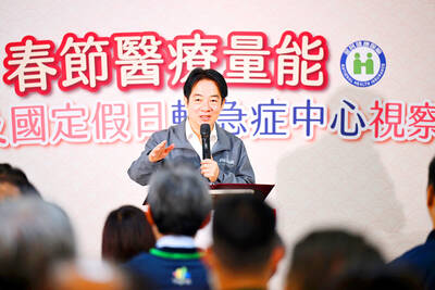 REAL EMERGENCIES: To avoid overcrowding, the health minister urged people with mild or moderate symptoms to go to UCCs, while the ER should be for critical cases President William Lai (賴清德) yesterday inspected the nation’s Lunar New Year medical preparedness with a visit to an urgent care center (UCC) in Taipei and expressed confidence in the Ministry of Health and Welfare’s plans to prevent emergency room (ER) overcrowding during the nine-day holiday.The mi