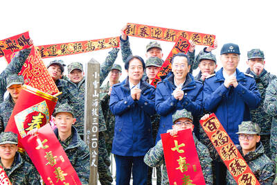 President William Lai (賴清德) yesterday delivered his Lunar New Year address, pledging to strengthen national defense and steadily advance economic development to ensure Taiwan maintains its leading edge in global technology and industrial competition.Lai joined officers and soldiers at the navy’s 3,0