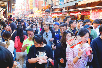 People yesterday shop for the upcoming Lunar New Year holiday at Dihua Street market in Taipei yesterday.