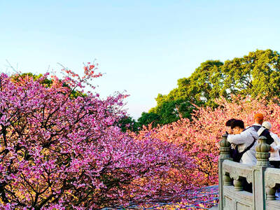 People look at cherry blossoms at Tianyuan Temple in New Taipei City’s Tamsui District yesterday.