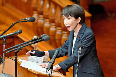 BIG GOALS The Japanese prime minister, fresh off a major win for her party in a snap election, said she aims to substantially update the nation’s defense strategy Prime Minister Sanae Takaichi pledged yesterday to make Japan “strong and prosperous,” while hitting out at China and pledging to keep “hitting the growth button” following her party’s landslide election win.“China is intensifying its attempts to unilaterally change the status quo by force or coerci