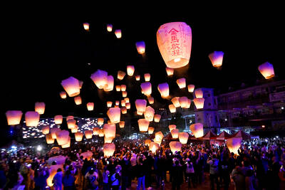 People release paper lanterns during the Pingsi Sky Lantern Festival at Pingsi Junior High School yesterday.