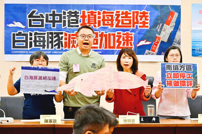 DOLPHIN DEFENDERS Environmentalists pled with the environment ministry to reconsider the possible impact of a Taichung port land reclamation project Environmental advocates yesterday urged the Ministry of Environment (MOENV) to suspend a land reclamation project by Taiwan International Ports Corp (TIPC) at Taichung port and put it through a second-stage environmental impact assessment (EIA) review.The Taichung port project has generated backlash