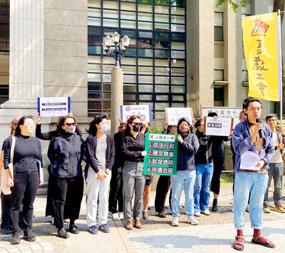 Chinese-language teachers from National Taiwan Normal University’s (NTNU) Mandarin Training Center (MTC) yesterday protested outside the school to demand better labor rights and protections.Of the center’s 90 language instructors, 73 have joined a labor union that is demanding a collective bargainin