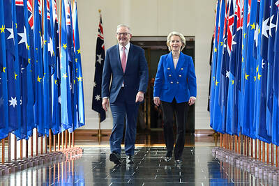 The EU and Australia yesterday struck a long-awaited free-trade deal, while also agreeing to boost defense cooperation and access to crucial rare-earth minerals in the face of global uncertainty over trade.European Commission President Ursula von der Leyen’s visit to Australia comes as the 27-nation