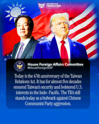 ‘ENVY OF THE WORLD’: The act and the ‘six assurances’ are part of what ‘enabled the stunning evolution of Taiwan’s democracy, economy and social system,’ AIT said US lawmakers on Friday marked the anniversary of the Taiwan Relations Act (TRA) with a post on X that emphasized the law’s key role in maintaining the security interests of Taiwan and the US.“Today is the 47th anniversary of the Taiwan Relations Act. It has for almost five decades ensured Taiwan’s s
