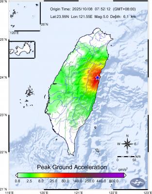 A magnitude 5 earthquake struck Hualien County at 7:52am today, the Central Weather Administration (CWA) said.The epicenter of the temblor was in the county's Jian Township (吉安), about 6.9km west of Hualien County Hall, at a depth of 6.1km, CWA data showed.There were no immediate reports of damage.T