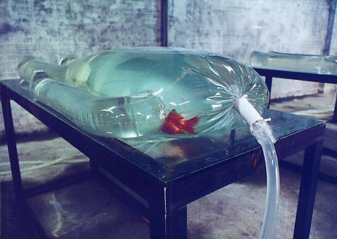 Two years ago, Lu jack-hammered into the concrete floor of the Bamboo Curtain Studio, making six holes for his piece "Floating IV." The holes appeared as disembodied heads. Nearby, resting on surgical tables, six plastic human-shaped forms filled with water and live gold fish were connected to a large fish tank complete with water plants that created an ecosystem. After the show ended, Lu covered the holes, where they remained dormant. Since the holes were already dug, Lu chose to reuse them for his latest work.
