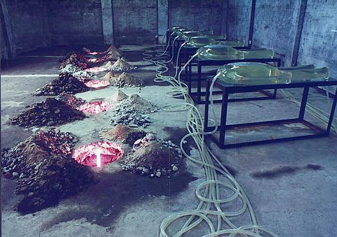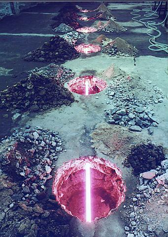 The piles of rocks, cement and sand, seemingly left over from some archaeological dig or perhaps a mystical sign from some witch, sit in little erect formations contrasted with the red luminous resin disks that sparkle like amber. Set on a diagonal access, the disks are placed into six shallowly dug holes. Welcome to the world of artist Lu Pei Lin, whose work "Floating V" is on exhibit at the Bamboo Curtain Studio until Nov. 21. In the Floating Series, Lu uses holes, fluorescent tubes, water, earthy materials and technological equipment to evoke the state of the body.
