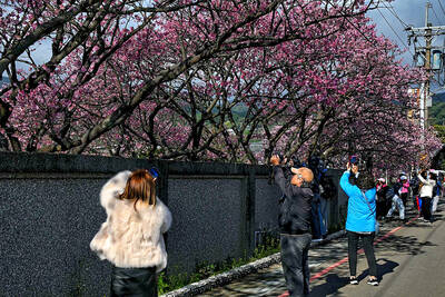 People photograph cherry blossoms yesterday on Lane 42, Pingjing Street in Taipei’s Shilin District, a popular place to view the flowering trees.