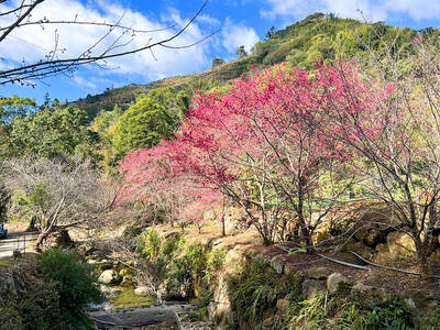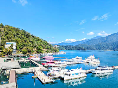 Boats are docked at Sun Moon Lake’s Shuishe Pier in Nantou County’s Yuchi Township yesterday. Shuishe is the main pier to explore Sun Moon Lake, which is expected to see a surge in tourists during the Lunar New Year holiday.