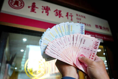 A person holds NT$1,000 and NT$100 banknotes at a Bank of Taiwan branch in Taipei yesterday. A total of 455 designated branches of eight financial institutions nationwide yesterday began allowing the public to exchange old banknotes for new ones, adding to the festive mood ahead of the Lunar New Yea