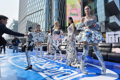 Models and a robot pose for photos at a promotion event for sofas in Beijing yesterday.