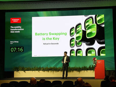 Gogoro Inc chief executive officer Henry Chiang addresses a Sustainability Week Asia event in Bangkok yesterday. Under the theme of “The Mobility Transformation Asia Needs,” Chiang shared Taiwan’s experience in promoting battery swapping as an alternative to charging. The annual event ends today.