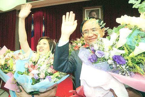 Carrying bouquets and blessings from colleagues, outgoing Minister of Economic Affairs Lin Yi-fu (