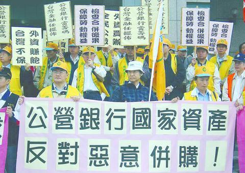 The union members suggested that the FSC itself should facilitate the establishment of the Taiwan Financial Holding Co (台灣金控), following the proposed merger of the Bank of Taiwan (台灣銀行), Land Bank of Taiwan (土地銀行), Taiwan Cooperative Bank (合作金庫) and Central Trust of China (中信局).