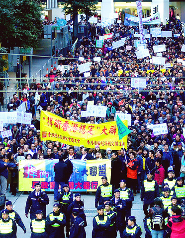 Thousands of protesters marched through downtown Hong Kong yesterday, accusing opposition lawmakers of sabotaging business deals and damaging the territory's image as a global financial hub.