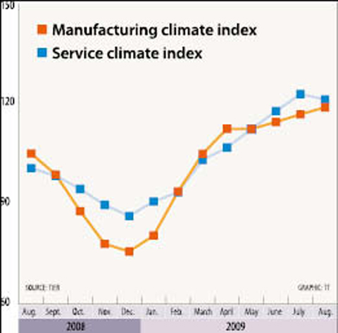 The survey, conducted by the Taiwan Institute of Economic Research (TIER, 台經院), on a monthly basis, put the climate gauge for the manufacturing sector at 118.89 points last month, up 2.09 points from 116.8 in July.