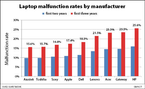 By contrast, more than one-fourth of HP laptops malfunction within three years, the study found. Acer and its sub-brand Gateway, meanwhile, had malfunction rates of about 23 percent.