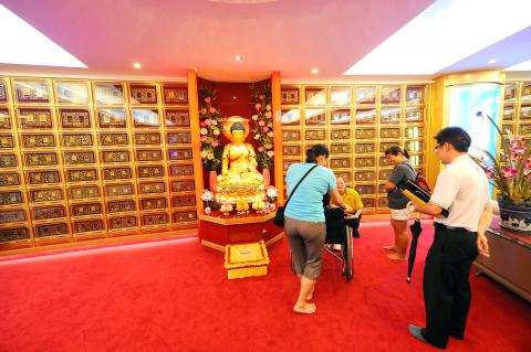 Inside the complex, gold-plated niches, Buddha statues and ancestral tablets await the ashes of the departed in fully air-conditioned “suites” complete with carpeted floors and sofas.