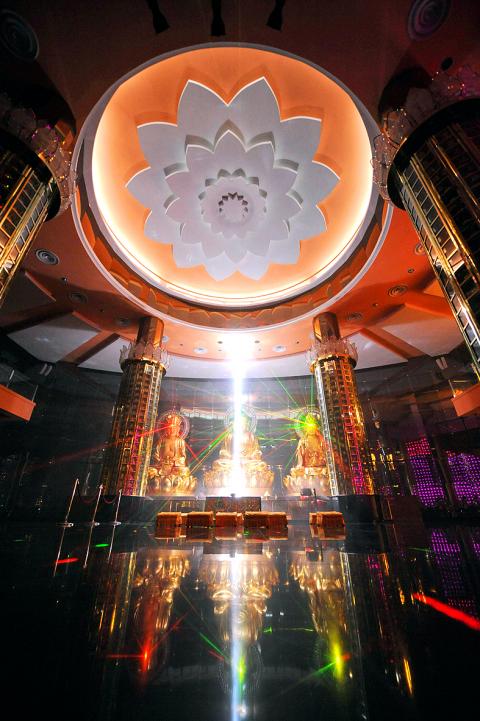 Green and red laser beams shot out from the foreheads of three 10m tall gold-plated Buddhas as soothing chants and ambient music played from cinema-quality loudspeakers.