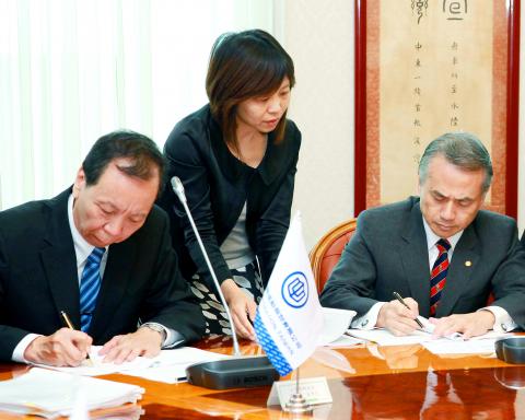 Evergreen Group vice -chairman Bronson Hsieh (謝志堅) and CSBC chairman Paul Tang (譚泰平) signed the contract at the former’s headquarters in Taipei yesterday morning.