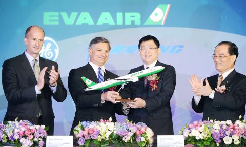 “Deployment of the additional seven of these aircraft and gradual replacement of our other aircraft types will standardize our fleet and give us greater operational flexibility,” EVA president Chang Kuo-wei (張國煒) said at the signing ceremony.