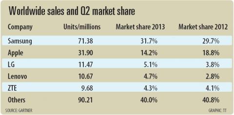 Meanwhile, China’s Lenovo Group Ltd (聯想) jumped to the No. 4 position in the worldwide smartphone market for the first time last quarter, after sales grew 144 percent year-on-year on booming demand in its home market. That Chinese demand represents more than 95 percent of its overall sales, but also a challenge for Lenovo to reach out elsewhere in the world, Gartner said.