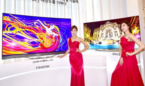 LG Electronics Inc unveiled two new giant organic light-emitting diode (OLED) TVs with ultra-high-definition screens yesterday, sticking with its strategy of using the exceptionally expensive OLED display technology.