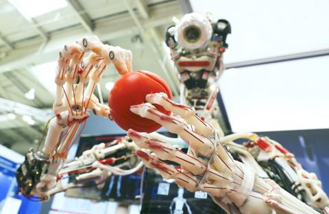 At another stand, German firm Beckhoff Automation GmbH & Co KG showed off an automated assembly line, which it said is able to seamlessly adapt itself to handle different parts according to their shape, size and color, while human coworkers are equipped with a special smartwatch to monitor the process and can intervene if necessary.