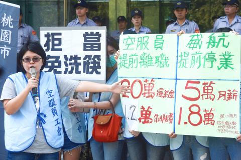 Union secretary-general Lin Chia-wei (林佳瑋) said that the Civil Aeronautics Administration (CAA) has indicated that airlines are not allowed to transfer aviation rights among themselves, but TransAsia suspended V Air services and started offering its profitable flights itself.