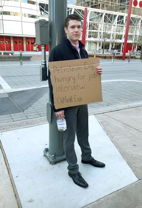 Despite using a depression-era sign to ask for introductions, he is hopeful demand for petroleum professionals will come back.