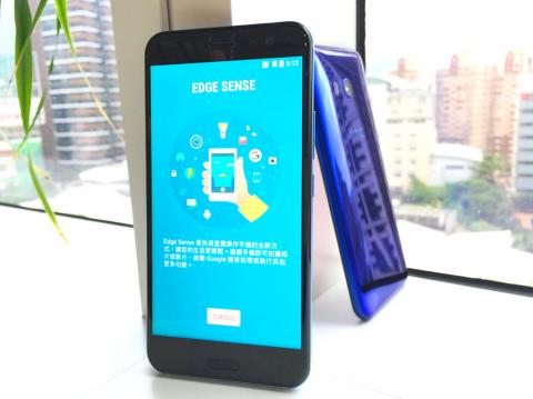 Taiwanese smartphone vendor HTC Corp (宏達電) yesterday unveiled the HTC U11, a new flagship handset, at the company’s headquarters in Taipei, with the firm hoping the model sparks a turnaround in its loss-making smartphone business.